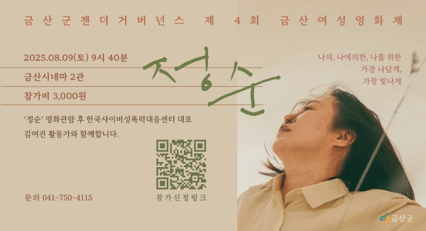 [충청뉴스 금산 = 조홍기 기자] 금산군 8월 9일 오전 9시 20분부터 금산시네마 2관에서 제4회 금산여성영화제를 개최하고 여성연대와 성평등 문화 확산에 앞장선다.