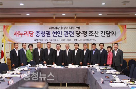 새누리당 소속 충청권 국회의원들은 2일 현오석 경제부총리 겸 기획재정부 장관을 상대로 한 당정 현안간담회에서 국제과학비즈니스벨트(이하 과학벨트) 성공 추진을 위한 내년 본예산 편성 및 태안유류피해대책 조속 해결, 대선 SOC 지역공약 이행 등 충청지역 현안 이행을 강력 요청했다.