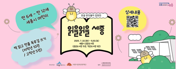 이번 캠페인은 한글문화도시 사업의 일환인 '한글 반딧불이 집현전' 프로그램으로, 세종시립도서관을 포함한 공공도서관 24곳과 지역 인증 서점이 함께 참여한다.