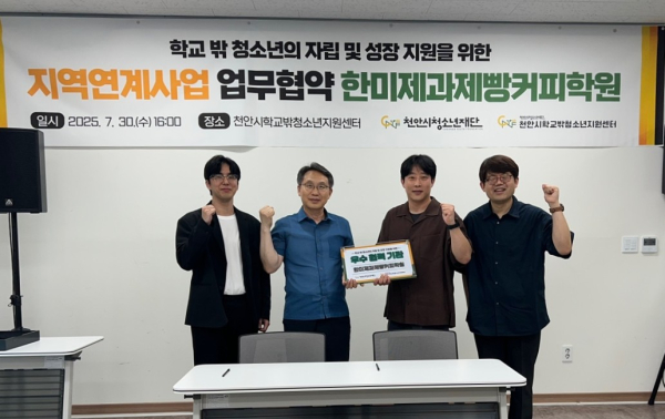 [충청뉴스 유규상 기자] 천안시청소년재단(대표이사 한상경) 천안시학교밖청소년지원센터는 30일, 한미제과제빵커피학원과 학교 밖 청소년의 진로 탐색과 직업 역량 강화를 위한 제과·제빵 자격증 취득반 운영 업무협약을 체결했다.