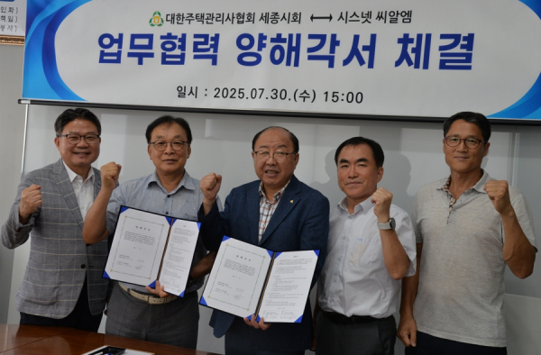 [충청뉴스 최형순 기자] 대한주택관리사협회 세종시회(회장 박상희)와 국내 유일의 멀티플랫폼 서비스 기술을 보유한 ㈜시스넷씨알엠(대표 조규영)이 30일 전략적 업무협약을 체결하고, 아파트 소모품 플랫폼 운용을 통해 공동주택 관리의 질을 높이는 데 협력한다.