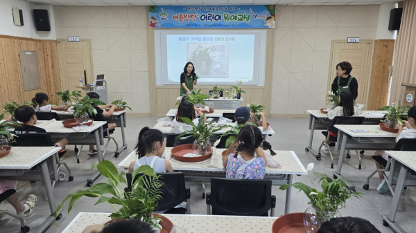 또한, 어린이원예교실 프로그램은 도시농업관리사에게 듣는 ▲탄소중립 이야기 ▲재활용 소재 활용 이야기 ▲수경식물 화분 만들기 실습으로 진행됐다.