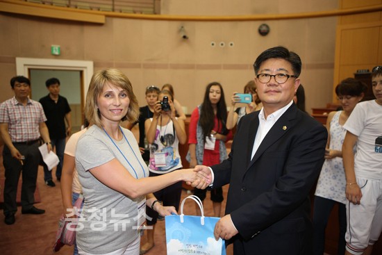 대전시의회 곽영교 의장은 15일 시의회를 견학.방문한 러시아 한류 의료관광 캠프 참가자들을 반갑게 맞이하면서 의회와 우리시를 좀 더 쉽게 이해할 수 있도록 홍보관과 본회의장 등을 함께 둘러보며 소개했다.