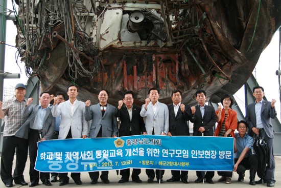 충청남도의회 5개 연구모임 중 하나인 ‘학교 및 지역사회 통일교육 개선을 위한 연구모임(대표 서형달 의원)’은 12일 해군 제2함대 사령부를 찾아 북한의 기습적인 포격도발에 맞서 싸우다 희생된 천안함 장병들의 정신을 기리고자 희생자에 대한 ‘묵념’을 시작으로 영상물과 유품 관람, 연평해전에 참전한 전남함을 견학하고, 천안소재 충남 통일교육협의회에서 통일교육 담당 교사를 위한 강의 자료를 직접 참관했다.