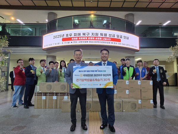 [충청뉴스 유규상 기자] 국제로타리 3620지구(총재 차명환) 아산지역 로타리클럽은  최근 집중호우로 피해를 입은 주민들을 위해 전기압력밥솥과 제습기 총 30대를 아산시에 후원했다.
