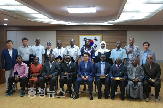 아산시 농업개발과정의 아프리카 8개국 16명의 농업연수생들이 2개월간의 교육을 마치고 지난 16일 시청 상황실에서 수료식을 가졌다.