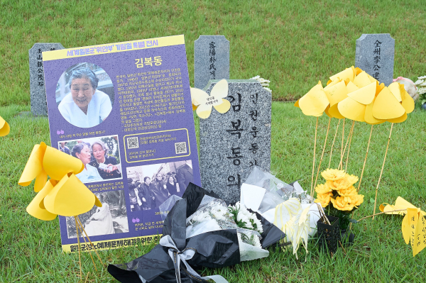 이날 김석필 천안시장 권한대행 부시장을 비롯한 천안시여성단체협의회 회원 등은 ‘위안부’ 피해자 추모비와 고 김학순·김복동 할머니 묘역에 헌화하며 넋을 기렸다. 국립망향의동산에는 총 57명의 일본군 ‘위안부’ 피해자가 안장돼 있다.