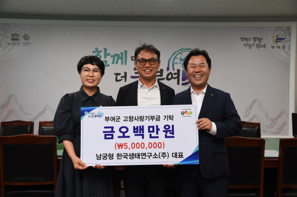 [충청뉴스 부여 = 조홍기 기자] 부여군(군수 박정현)은 장암면 출신 남궁형 ㈜한국생태연구소 대표가 올해 고향사랑기부금 5백만 원을 전달했다고 19일 밝혔다. 남궁형 대표는 지난해와 재작년에도 각각 200만 원씩 기부해, 3년간 총 900만 원을 기부하며 고향 사랑과 나눔을 실천하고 있다.