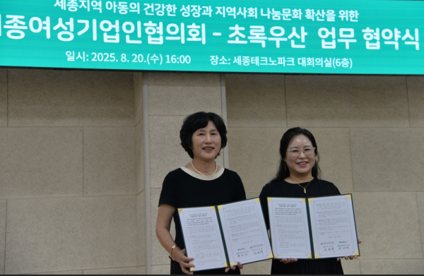 [충청뉴스 최형순 기자] 세종여성기업인협의회(회장 이연재, 이하 ‘여기협’)와 초록우산 세종지역본부(본부장 박미애) 는 20일 세종테크노파크 6층 대회의실에서 세종지역 아동의 건강한 성장과 지역사회 나눔 문화 확산을 위한 사회공헌 업무협약을 체결했다.