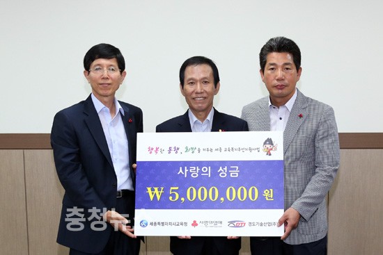 세종특별자치시교육청(교육감 신정균)은 23일 오전 교육감실에서 경도기술산업(대표이사 박종진), 세종사회복지공동모금회(사무소장 서영일)와 함께 소외계층 학생을 위한 사랑의 성금 전달식을 가졌다.