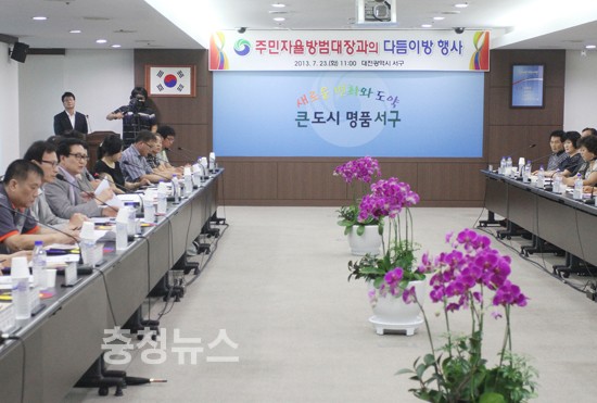 대전광역시 서구(구청장 박환용)는 23일 구청 대회의실에서 구민이 안전한 도시, 살기 좋은 서구를 만들기 위해 서구 관내 주민자율방범대장 42명이 참석한 가운데 “아름다운 동행, 다듬이방”행사를 가졌다.