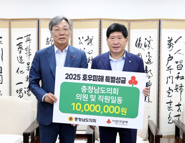 [충청뉴스 박영환 기자] 충남도의회는 21일 의장 접견실에서 호우 피해 이재민을 위해 의회 의원들과 직원들이 자발적으로 모금한 성금 1천만 원을 충남사회복지공동모금회(성우종 회장)에 전달했다고 밝혔다.