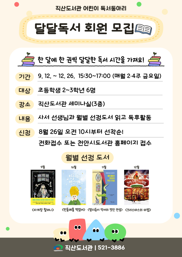 [충청뉴스 유규상 기자] 천안직산도서관(관장 이충미)은 오는 9월 12일~ 12월 26일 어린이 독서동아리 ‘달달독서’를 운영한다.