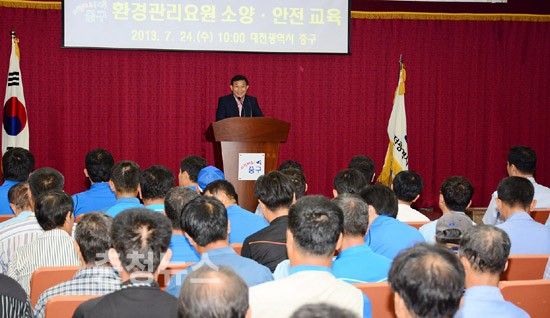대전시 중구(구청장 박용갑)는 24일 대회의실에서 무더위 속에서도 깨끗한 도시환경 조성을 위해 최선을 다하는 환경관리요원 등 125명을 대상으로 소양교육을 실시하고 노고를 격려한 후, 중식으로 삼계탕을 제공했다.