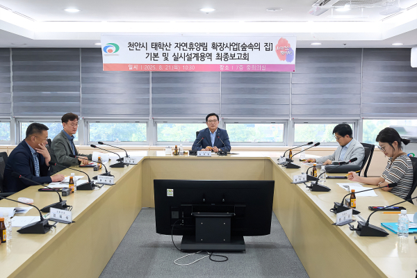 [충청뉴스 충청뉴스 ] 천안시는 지난 21일 시청 중회의실에서 ‘태학산 자연휴양림 숲속의 집 확장사업 기본 및 실시설계최종 보고회’를 개최했다.