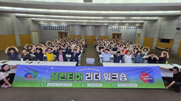 [충청뉴스 유규상 기자] 천안시자원봉사센터는 지난 22일 천안시청 대회의실에서 시 소속 50여 개 자원봉사단체 리더와 임원 100여명이 참여한 가운데 자원봉사 볼런티어 리더 워크숍을 개최했다.