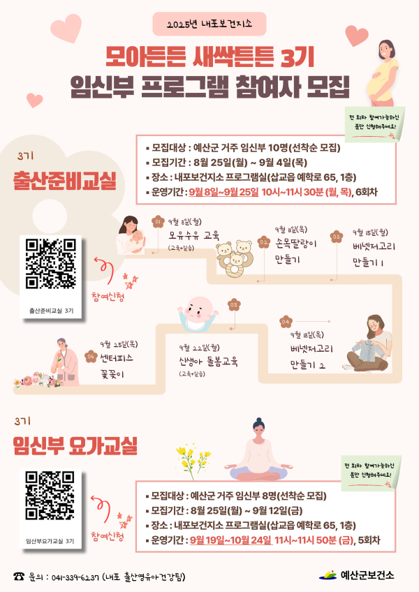 이번 하반기 프로그램은 임산부 대상 △출산준비교실(9월, 11월) △임산부 요가교실(9∼10월, 11∼12월)로 구성되며, 출산준비교실은 주 2회, 요가교실은 주 1회 내포 보건지소에서 각각 운영된다.