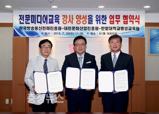 한밭대학교 평생교육원(원장 김철규)은 지난 24일 교내 대학본부(N1동) 2층 대회의실에서 한국방송통신전파진흥원 및 대전문화산업진흥원과 함께 ‘대전지역 미디어교육 강사양성을 위한 다자간 업무협약’을 체결했다.
