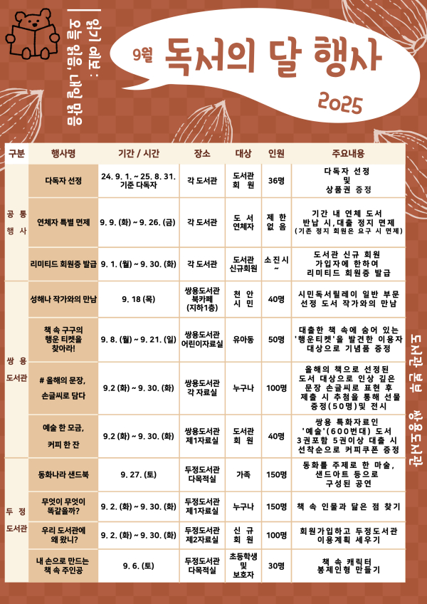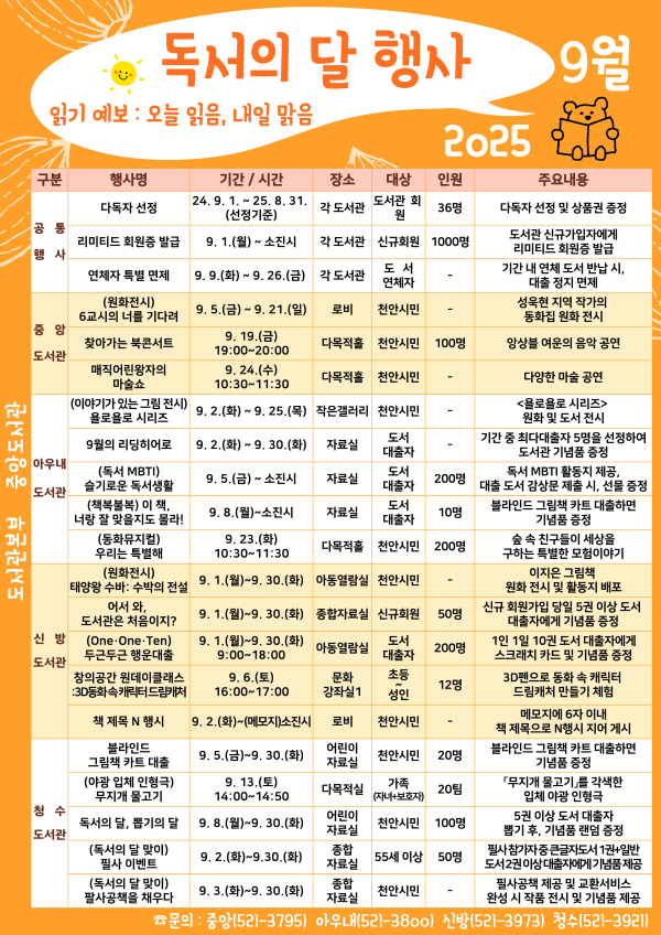 프로그램에는 ‘읽기 예보: 오늘 읽음, 내일 맑음’을 주제로 9개 도서관(중앙·아우내·신방·청수·쌍용·두정·성거·도솔·직산)과 9개 공립작은도서관에서 연체자 특별 면제부터 공연, 이벤트 등 다채로운 프로그램을 마련했다.