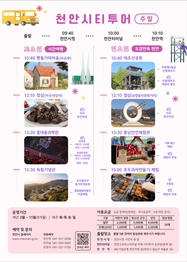 오는 11월까지 운영되는 시티투어는 화·목·토·일요일 주 4회 운행하며 각 코스별로 역사, 체험, 자연, 과학 등 천안의 다양한 매뉴를 담았다.