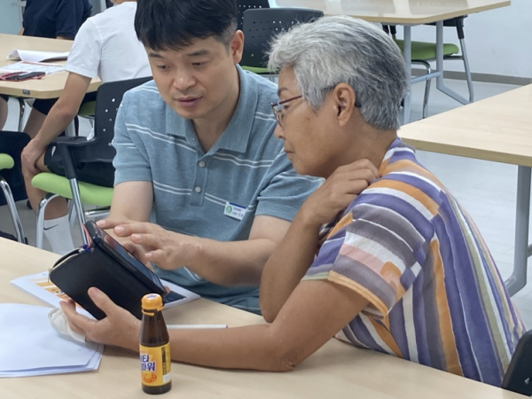 천안교육청 직원들이 어르신들에게 스마트폰 활용법을 설명하고 있다