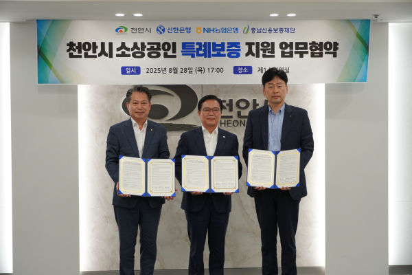 [충청뉴스 박영환 기자] 충남신용보증재단은 지난 28일 천안시청에서 천안시, 신한은행, 농협은행과 함께 총 120억 원 규모의 소상공인 특례보증을 위한 업무협약을 체결했다고 29일 밝혔다.