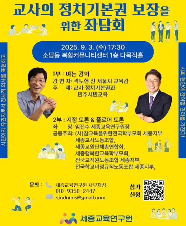 [충청뉴스 최형순 기자] 세종교육연구원(원장 임전수)은 9월 3일 오후 5시 30분 소담동 복합커뮤니티센터 1층 다목적홀에서 '교사의 정치기본권 보장을 위한 좌담회'를 개최한다.