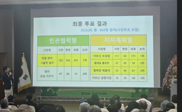 한편 2026년도 마을 의제의 사업 우선순위를 결정에 있어서는 민관협력형에서는 마을 벤치 그늘막 설치가 1위로 선정되었으며, 자치계획형 유형에서는 어르신 보살핌, 둘레길 플로킹, 행복한 배움터 등 3개의 사업이 우선 순위로 결정되었다.