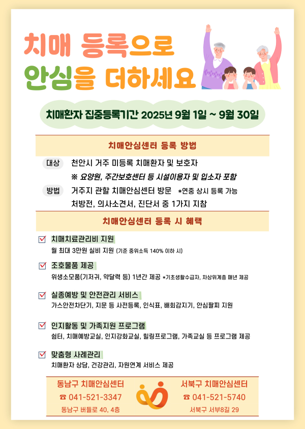 센터는 9월을 치매극복의 달로 정하고, 치매 환자들의 치매안심센터 등록을 독려할 계획이다. 대상은 치매안심센터에 등록하지 않은 천안 거주 치매 환자로, 치매 진단서, 의사 소견서, 처방전 중 1가지를 지참해 거주지 관할 치매안심센터에 방문하면 된다.