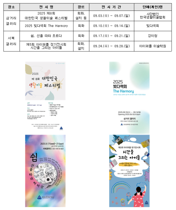 삼거리 갤러리에서는 ▲9월 3~ 7일, 2025 제8회 대한민국 생활미술 페스티벌 ▲9월 10~ 14일, 2025 빛다색회 The Harmory를 연다.
