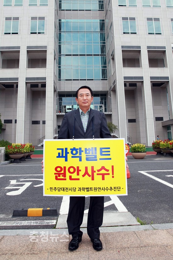 윤 의장은 “수정안에 대한 반대여론이 들끓는 상황에서 정부와 대전시가 무리하게 수정안대로 강행하려는 것은 대전시민과 충청도민 모두를 무시하는 처사”라며 “지금이라도 정부와 대전시는 수정안 논의를 철회하고 국가발전을 위해 과학벨트사업의 원안 추진을 촉구한다”고 1인시위에 나선 배경을 밝혔다.