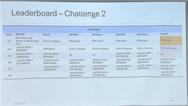 최종 순위에서 ETRI는 추적 분야 1위를 차지했으며 2위는 중국 장난대학교와 영국 서리대학교 공동 연구팀이 차지했다. 탐지 분야에서는 대만 양명교통대학교가 1위, ETRI가 2위를 기록하며 글로벌 최고 수준의 경쟁력을 입증했다.