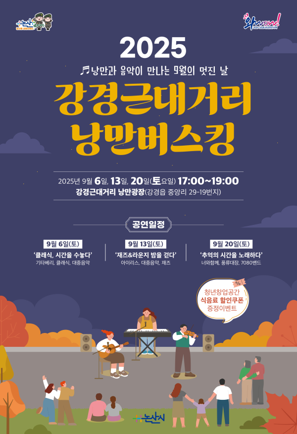 [충청뉴스 논산 = 조홍기 기자] 논산시(시장 백성현)가 오는 9월 6일부터 20일까지 3주간, 매주 토요일 오후 5시부터 7시까지 강경근대거리 낭만광장에서 ‘2025 강경근대거리 낭만버스킹’을 개최한다고 밝혔다.