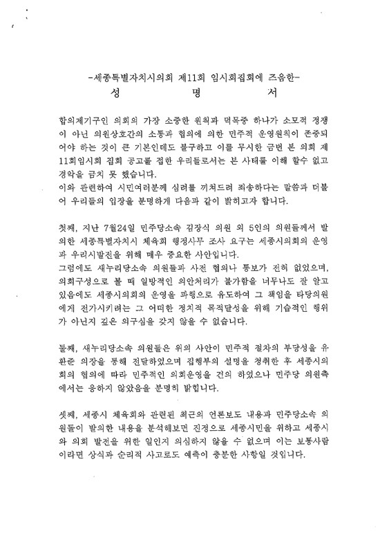 개회 전 새누리당 소속 7명의 의원이 민주당의 세종시 체육회 행정사무조사 요구에 대한 입장을 공동명의로 성명서를 배포했다.