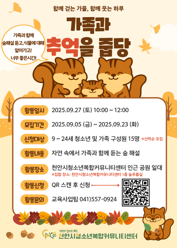 참가비는 무료이며 천안시 관내 청소년을 포함한 가족 대상으로 9월 23일 화요일까지 15명 선착순 모집 진행한다.