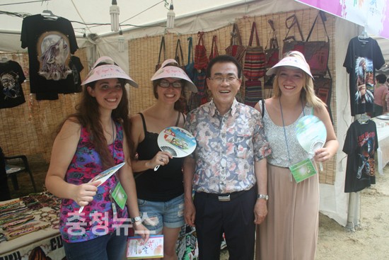 ▲ 조치원 복숭아 축제장을 찾은 유한식 시장과 외국인