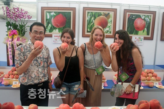 ▲ 조치원 복숭아 축제 유한식 시장과 외국인 여성들이 복숭아을 먹는 모습 연출