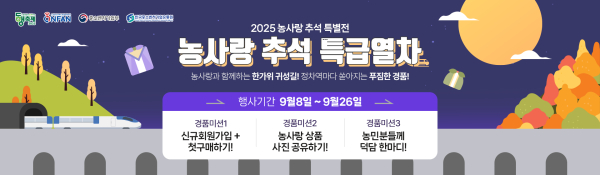 이번 특별전에서는 ‘추석 특급열차’ 컨셉트로 꾸며지며, 다양한 고객참여 이벤트도 마련됐다. 신규 회원가입, 구매 인증 사진 등록, 충남 호우 피해 농가 응원 메시지 작성 등에 참여한 고객에게는 추첨을 통해 푸짐한 경품이 제공된다.