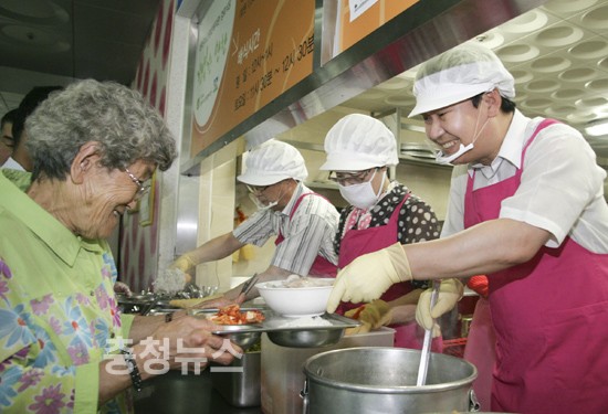 ▲ 정용기 구청장이 12일 말복을 맞아 복지관 이용 어르신 및 독거노인에 삼계탕 배식봉사를 실시하고 있다.