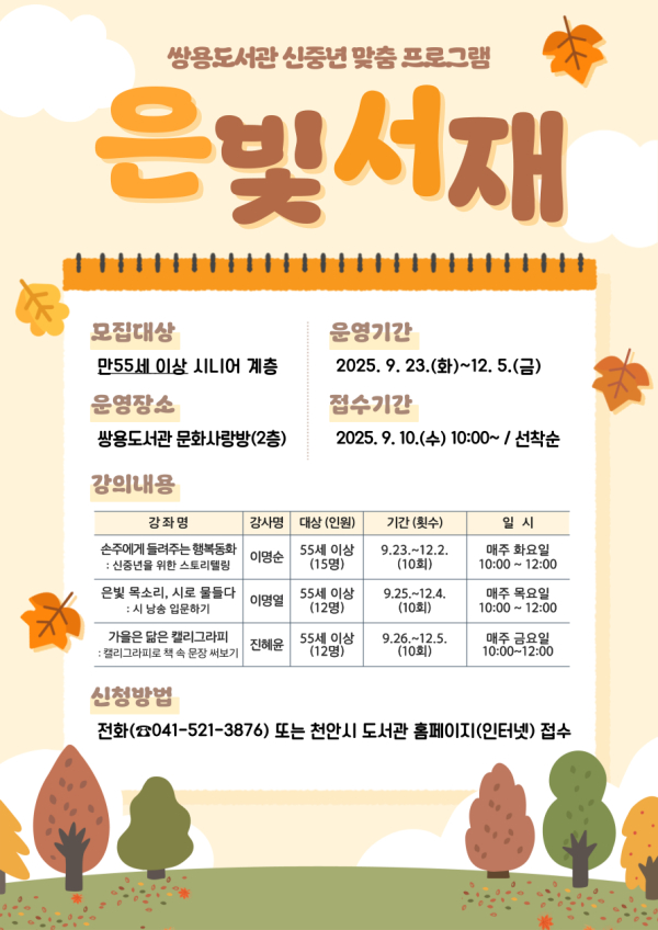 신중년 은빛서재는 오는 23일부터 12월 5일까지 운영되며, ▲손주에게 들려주는 행복동화 ▲은빛 목소리, 시로 물들다 ▲가을을 닮은 캘리그라피를 만나볼 수 있다.