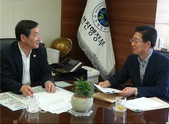 민주당 양승조(천안갑) 국회의원이 유정복 안전행정부 장관을 만나 지역 현안사업 해결에 앞장서 달라고 당부했다.
