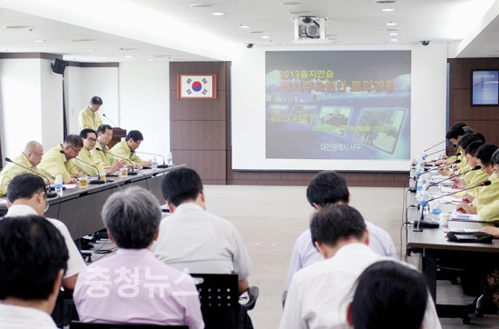 이날 토의는 적의 사이버테러 공격과 적 특작부대 1개 소대 침투에 의한 가수원교, 아파트 3개 동, 월평정수장 여과지 완파라는 가상 하에 전산시스템 복구대책, 전재민 구호대책, 민방위대원 동원과 비상급수대책 등의 해결방안에 대한 발표로 진행됐다.