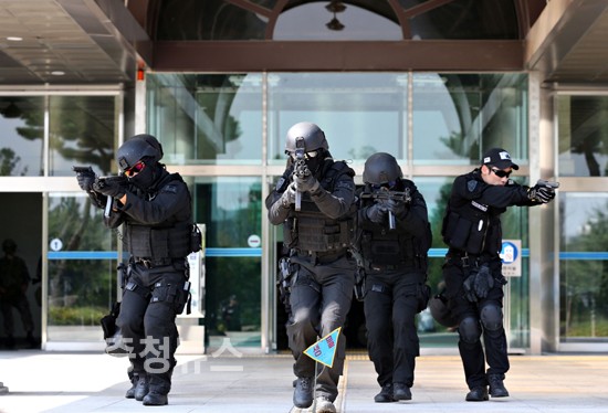 실제훈련에는 경찰청 헬기와 화학 제독차량, 구급차 등이 동원돼 경찰특공대·헌병특임대의 테러진압과 생화학․제독차 등을 활용한 누출 화학물질 수거․제독, 인명구조․사상자 응급처치와 건물화재 진압 등이 생생하게 진행됐다.