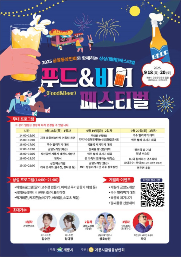 금암광장공원(신도안오리 옆) 일원에서 18일부터 20일까지 3일간 개최되는 금암동 상상페스티벌(Food & Beer Festival)은 18일 ▲개막식 ▲축하공연(정다경, 김수찬, 마진기, 영호)등이 펼쳐진다.