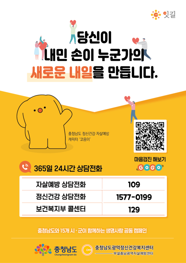 삶에 희망이 보이지 않을 때는 고민하지 말고 자살예방 상담전화(109), 천안시 서북구자살예방센터(041-578-9709), 동남구자살예방센터(041-521-3339)로 상담을 요청하면 도움을 받을 수 있다.