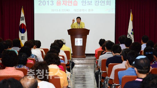 대전시 중구(구청장 박용갑)는 22일 중구청 대회의실에서 통일안보 전문교육강사인 양주형교수를 초빙해 을지훈련 근무자와 유관기관 참가자, 구.동 방위협의회원 및 일반주민 등 200명을 대상으로 안보의식 강화를 위한 안보강연회를 개최했다.