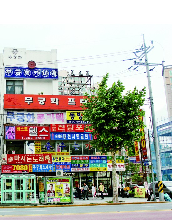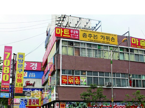 무궁화 백화점 외관에 덕지덕지 붙은 간판을 보면, 어린 시절 장롱에 마구잡이로 붙여 놓았던 스티커가 떠오른다. 스티커만 손에 쥐어 주면 엄마가 허락한 공간(주로 장롱문)에 다 붙여놓곤 했다. 뗄 수도 없이 더덕더덕 붙였던 스티커와 무궁화 백화점의 간판은 많이 닮아 있었다.