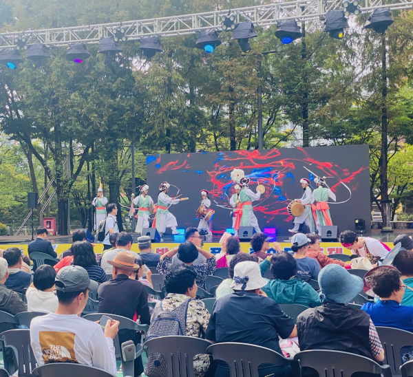 쌍용3동 주민총회에 앞서 농악단 공연이 진행되고 있다.