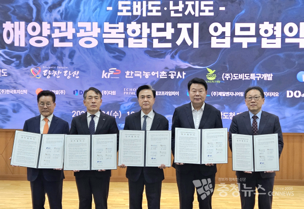 충남도는 24일 도청 대회의실에서 김태흠 지사, 오성환 당진시장, 조영호 한국농어촌공사 기획전략이사, 인장환 도비도특구개발 대표, 김호석 대일레저개발 회장 등이 참석한 가운데 '도비도·난지도 해양관광복합단지 업무협약'을 체결했다.