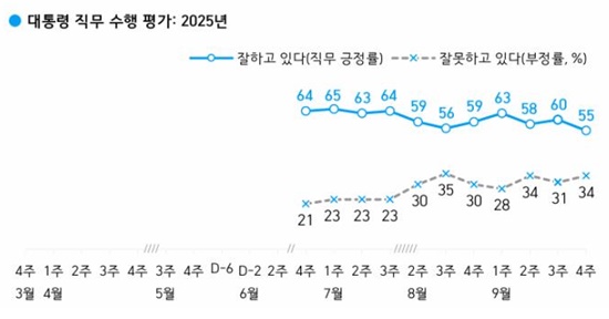 이는 조국 조국혁신당 비상대책위원장 특별사면 논란의 영향권에 있었던 8월 3주차 56%보다 낮은 수치로, 취임 후 최저치다. 부정평가 또한 3%p 상승해 34%를 기록했다.